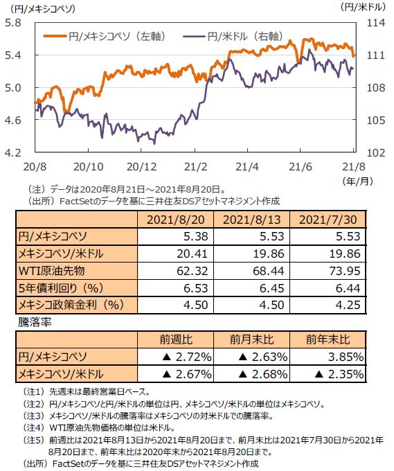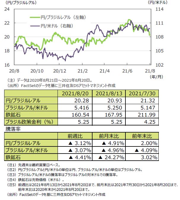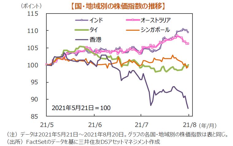 世界の主要株式市場は下落しました。新型コロナウイルスのデルタ型の感染拡大による景気減速や米国の量的金融緩和の早期縮小への懸念が相場の押し下げ要因となりました。米国株式市場は、7月の小売売上が下振れたことや量的金融緩和の早期縮小の見方が高まり、今後の景気鈍化が意識され、売り圧力が高まりました。NYダウは週間では1.11%下落しました。日本株式市場は、デルタ型の感染拡大とその影響による生産活動の低迷見通し、中国の7月の主要経済統計の下振れ等を嫌気して大きく下落しました。週間では日経平均株価は3.45%下落しました。欧州株式市場も、米国株の下落や中国経済の鈍化を懸念して下落しました。独DAX指数は、1.06%、英FTSE100指数は1.81%下落しました。中国株式市場は、7月の小売売上、鉱工業生産等の主要経済統計が下振れたほか、インターネット企業に対する新たな規制強化が発表されたこと等を嫌気して下落しました。また20日には個人情報保護法が成立し、個人データの海外への持ち出しが厳しく制限されることとなりました。上海総合指数は2.53%、香港ハンセン指数は5.84%下落しました。