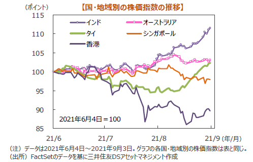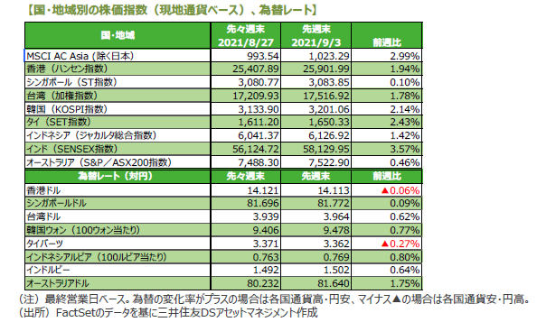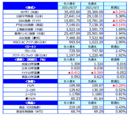 世界の主要株式市場は高安まちまちとなりました。米国株式市場では、NYダウが小幅安となる一方、ナスダック総合は最高値を更新しました。注目された週末の米雇用統計では、非農業部門雇用者数が市場予想を大幅に下回り、景気回復への懸念からNYダウが下落する一方、早期の量的金融緩和の縮小(テーパリング)観測が後退したことから、ナスダック総合は一段と上昇しました。NYダウは週間で0.24%下落しました。日本株式市場は、前週末の米株式市場上昇を受けて週初から上昇して始まり、週末にかけて一段高となりました。日経平均株価は28,000円を回復した後も連日続伸し、週末には菅首相の総裁選挙不出馬の表明を受けて次期政権の経済対策期待から2カ月ぶりに29,000円を回復しました。週間では5.38%の大幅上昇となりました。一方、欧州株式市場では、独DAX指数が0.45%、英FTSE100指数が0.14%の小幅安となりました。中国株式市場は、発表された製造業PMIが弱かったものの、中国政府の景気支援策への期待から上昇しました。中国本土市場の上海総合指数は1.69%、香港ハンセン指数は1.94%上昇しました。