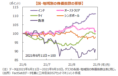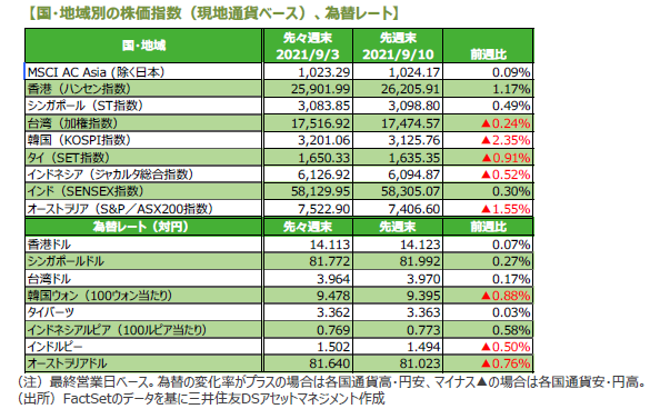 世界の主要株式市場は高安まちまちとなりました。米国株式市場は、前週末の8月雇用統計で非農業部門雇用者数が市場予想を下回り、景気回復ペースが鈍るとの懸念や、8月の生産者物価が市場予想を上回ったことなどが重しとなり、下落しました。NYダウは週間で2.15%下落しました。一方、日本株式市場は、自民党総裁選を控え、候補者による経済政策の発表で財政支出への期待が高まったことや、新型コロナウイルスの新規感染者数が減少していることを背景に、大幅に続伸しました。日経平均株価は約半年ぶりに終値で30,000円を回復し、週間では4.30%の大幅高となりました。欧州株式市場では、独DAX指数が1.09%、英FTSE100指数が1.53%の下落となりました。米株市場の下落や欧州中央銀行(ECB)の量的緩和の縮小(テーパリング)への警戒感、英国の増税計画などが嫌気されました。中国株式市場は、中国政府の景気支援策への期待などから続伸しました。中国本土市場の上海総合指数は3.39%、香港ハンセン指数は1.17%上昇しました。