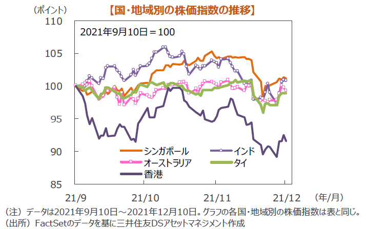 世界の主要株式市場は、軒並み上昇しました。米国株式市場は、米首席医療顧問が新型コロナウイルスのオミクロン変異株(以下、オミクロン型)の重症化リスクは高くないようだと発言したことや、11月の消費者物価指数が予想通りで金融引き締めへの警戒感が後退したことから投資家のリスク選好が強まり、大幅に上昇しました。NYダウは週間で4.02%高となりました。日本株式市場もオミクロン型への警戒感が和らいだことから反発しました。日経平均株価は週末にかけて伸び悩んだものの、1.46%高で終了しました。欧州株式市場は、オミクロン型への過度な警戒感が後退したことや米国株式市場が上昇したことを受けて上昇しました。英FTSE100指数は2.38%高、独DAX指数は2.99%高となりました。中国株式市場は、中国人民銀行が預金準備率を引き下げたことやオミクロン型への警戒感が和らいだことから上昇しました。中国本土市場の上海総合指数が1.63%高、香港ハンセン指数は0.96%高で終了しました。