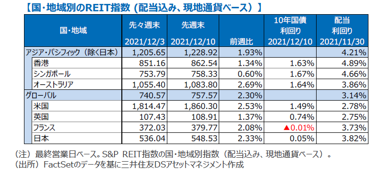 グローバル・リートは、オミクロン型への警戒感が後退したことを受けて、週間で2.30%高となりました。