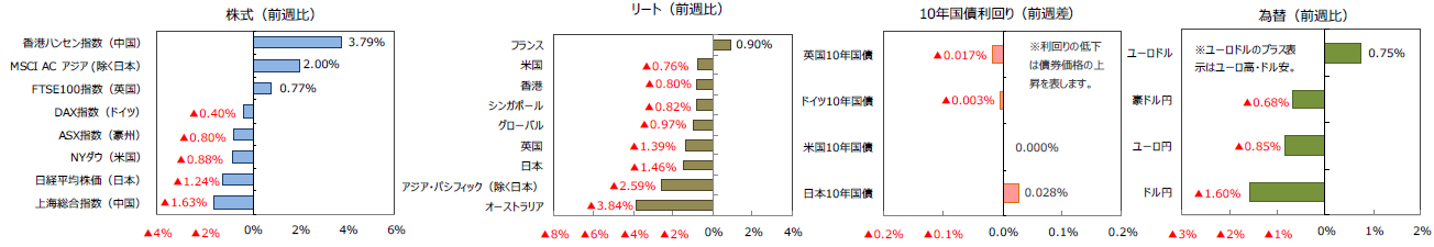 世界の主要株式市場は、高安まちまちとなりました。米国株式市場は、複数の連邦準備制度理事会(FRB)理事が利上げに積極的な姿勢を示すなど、FRB高官のタカ派発言が相次ぎ、金融政策の正常化が早まるとの見方が嫌気されて下落しました。NYダウは週間で0.88%安となりました。日本株式市場も、FRB理事の発言で一段と金融政策の正常化観測が高まるなか、米国株式市場が下落したことを受けて続落しました。日経平均株価は1.24%安で終了しました。欧州株式市場では、米国株式市場の下落を受けて独DAX指数が0.40%安となる一方、エネルギー株や金融株の上昇にけん引され、英FTSE100指数は0.77%高となりました。中国株式市場では、新型コロナウイルスの感染拡大に対する警戒感などから中国本土市場の上海総合指数が1.63%安となる一方、香港ハンセン指数は3.79%高で終了しました。