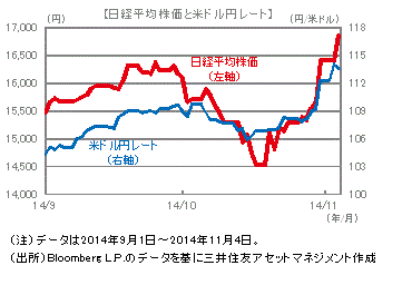 米国株式は上昇しました。日銀の追加緩和や好調な企業決算などから、NYダウの週末終値は17,573.93ドルをつけ、最高値を更新しました。堅調な経済指標が多かったこと、中間選挙で共和党が上下院で過半数を獲得したこと、ECBの追加緩和期待が高まったことも追い風となりました。