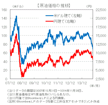 原油価格は大きく下落しました。OPEC総会での減産見送りの公表から、28日のNY市場で原油先物相場は一時、1バレル65ドルまで急落し、約4年半ぶりの安値をつけました。