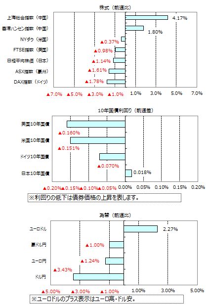 欧米の金利は低下しました。雇用統計が市場予想を大きく下回り、米連邦準備理事会(FRB)による早期利上げ観測が後退したことから、欧米の債券に買いが入りました。米国10年国債利回りは、1.700%で引け、前週末比0.15%の金利低下となりました。ドイツ10年国債の利回りは0.068%と、過去最低水準を更新しました。一方、日本の10年国債利回りは、小動きの中で、▲0.095%と、前週末比小幅上昇しました。