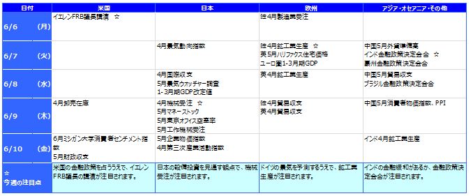 世界の株式市場は高安まちまちとなりました。週末に発表された、5月の雇用統計が市場予想を大幅に下回ったこともあり、欧米の株式市場は下落しました。米国株式市場のNYダウは、週間で、小幅な下げとなりました。欧州株式市場のドイツDAX指数は、前週末比約1.8%下落しました。一方、中国株式市場では、世界の多くの機関投資家が利用する株価指数であるMSCIインデックスについて、人民元建てA株の新興国株式指数への採用が決まるとの期待が強まり、上海総合指数が大幅に上昇しました。日本の株式市場では、安部首相が消費増税先送りを発表した際、早期の経済対策を示さなかったことから、政策期待が剥落し、日経平均株価が下落しました。