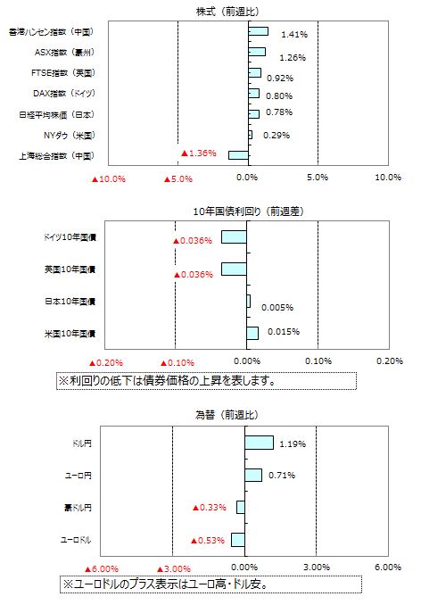 世界の株式市場は、総じて堅調な動きとなりました。英国の欧州連合(EU)離脱選択から約1カ月がたち、株式市場は落ち着きを取り戻しています。米国株式市場では、好調な企業決算を受けて、NYダウが過去最高値を更新するなど堅調に推移し、4週連続の上昇となりました。欧州株式市場のドイツDAX指数は、週間で+0.80%高と、続伸しました。一方、中国株式市場では、利益確定売りで上値の重い展開となり、上海総合指数が前週末比▲1.36%の下落となりました。日本の株式市場では、円安進行や欧米株高が好感され、日経平均株価は底堅く推移しました。週末は利食いに押されたものの、週間では+0.78%上昇と、続伸しました。