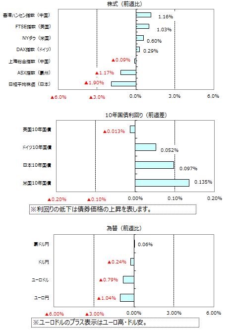 日米欧の長期金利は上昇しました。週末の米雇用統計が市場予想を大幅に上回ったため、米連邦準備制度理事会(FRB)が年内にも利上げに動くとの見方が強まり、欧米債券が売られました。米国10年国債利回りは、1.589%で引けました。ドイツ10年国債の利回りも▲0.067%に上昇しました。一方、日本の10年国債利回りは、日銀の金融政策をめぐる不透明感が嫌気され、▲0.093%に上昇しました。
