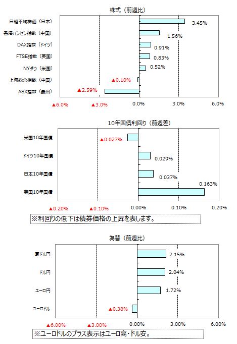世界の株式市場は高安まちまちとなりました。米国株式市場では、8月の米雇用統計で非農業部門雇用者数が市場予想を下回り、米連邦準備制度理事会(FRB)は追加利上げを急がないとの見方が強まり、買い安心感につながりました。NYダウは前週末比+0.5%と、反発しました。欧州株式市場のドイツDAX指数も+0.9%と、上昇しました。一方、中国株式市場は方向感が乏しく小動きの中で、上海総合指数が小幅に続落しました。日本の株式市場は、前週のイエレンFRB議長らの発言を受け、米国の利上げ観測が強まったことで円安が進んだため、大きく反発しました。日経平均株価は、週間で3%を超える上昇となりました。