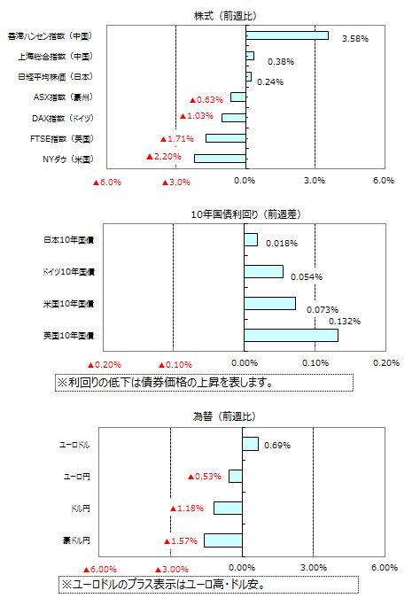 世界の株式市場は高安まちまちとなりました。欧米では、長期金利が急上昇したため、株式の売りが増えました。米国株式市場では、米連邦準備制度理事会(FRB)の追加利上げ前倒しの見方が強まり、NYダウは約2カ月ぶりの安値で終えました。欧州株式市場のドイツDAX指数も、金利上昇による金融環境の引き締まりが意識され、週間で1.0%下落しました。一方、中国株式市場では、新たな官民パートナーシップ(PPP)計画が公表されると伝わり、上海総合指数が小幅反発しました。日本の株式市場では、日経平均株価が一時17,000円台を回復しましたが、円相場が反発したこともあり、小幅高にとどまりました。