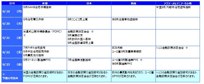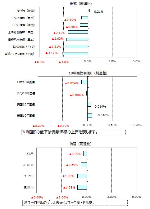 世界の株式市場は、米国など一部を除き、総じて下落しました。次週の米連邦公開市場委員会(FOMC)を控えて市場が神経質になるなか、ドイツ銀行の住宅ローン担保証券の不正販売問題が再度浮上し、金融株中心に欧州株が売られました。また、原油価格の下落も株価の下押し要因となりました。米国株式市場では、NYダウが前週末比小幅高で引けました。一方、欧州株式市場のドイツDAX指数は、2.8%の下落となりました。中国株式市場では、上海総合指数がほぼ1カ月ぶりの安値水準で引けました。日本の株式市場では、為替相場が円高・ドル安に振れたことなどが投資家の心理を冷やし、日経平均株価は2.6%の下落となりました。