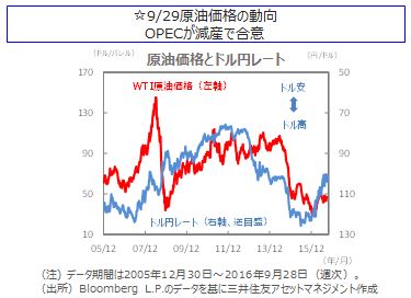 世界の株式市場は、高安まちまちとなりました。石油輸出国機構(OPEC)の減産合意を受け原油価格が上昇したものの、ドイツ銀行の経営難が欧州金融システム全般のリスクにつながるとの見方が強まり、投資家心理が悪化しました。米国株式市場では、NYダウが週間で小幅高となりました。欧州株式市場のドイツDAX指数は、ドイツ銀行を巡る問題が嫌気され、1.1%下落しました。中国株式市場では、上海総合指数が一時3,000ポイントを割り込むなど軟調に推移しました。日本の株式市場では、方向感の定まらない展開となるなか、ドイツ銀行の経営問題への警戒感などから売りが膨らみました。日経平均株価は週間で1.8%下落して終了しました。