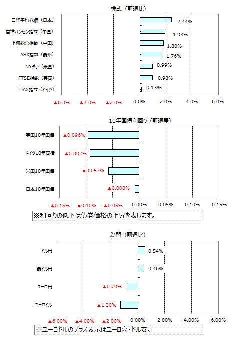 世界の株式市場は、軒並み上昇しました。トランプ米大統領による金融規制緩和策や減税などの税制改革が米景気を押し上げるとの見方から投資家のリスク選好姿勢が強まりました。米国株式市場では、NYダウが週末にかけて連日で過去最高値を更新しました。欧州株式市場では、英FTSE指数やドイツDAX指数が上昇しました。中国株式市場では、公共インフラ投資など経済政策への期待から買いが優勢になり、上海総合指数が約2カ月ぶりの高値となりました。日本の株式市場は、トランプ氏の貿易政策や日米首脳会談を前にした警戒感から一時下落しましたが、週末に米株高や円安を受けて買い戻しが入り、日経平均株価は大きく反発しました。