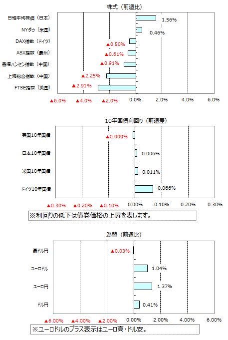 円相場は、地政学リスクへの警戒感がやや緩んだことや、米国で近い将来の税制改革発表の話が出たこと、欧州との金利差拡大などを背景として、全般的に円安の地合いとなりました。先週の円は、対米ドルで1ドル=108円近辺から109円台に円安となり、対ユーロでは1ユーロ=115円台前半から116円台後半へ円安となって引けました。