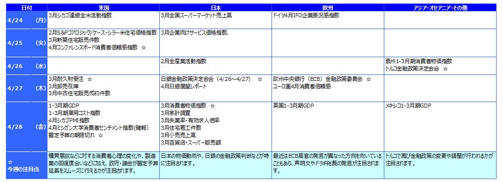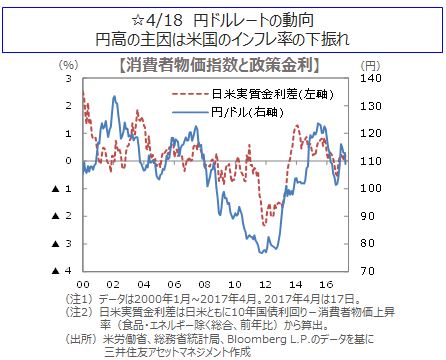 米国や日本では、地政学リスクへの警戒感がやや後退したものの、英国の総選挙前倒しなどの材料もあり、週を通してみると概ね横這いで引けました。ドイツでは、4月23日に行われるフランスの第1回大統領選挙に向けて金利がかなり低下していたこともあり、選挙前にポジション調整の売りが出た模様で、長期金利は上昇しました。