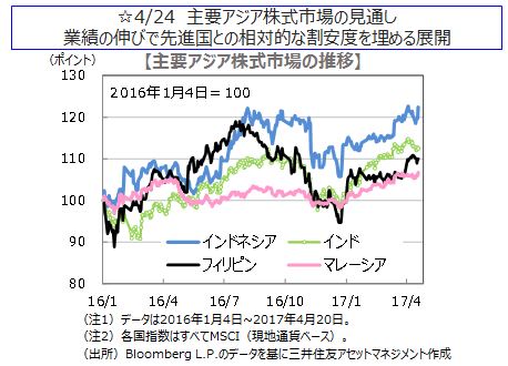 世界の株式市場は、概ね上昇しました。北朝鮮などの地政学リスクへの警戒感が弱まったほか、フランス大統領選挙の第1回投票結果では、概ね予想通りの結果となったことなどから、投資家のリスク取得意欲が高まりました。米国株式市場では、上記に加え、政府からの税制改革に関する発表への期待もポジティブ要因となり、上昇しました。日本株式市場でも、地政学リスクの緩和や第1回フランス大統領選挙の結果、為替市場が円安基調となったことなどが好感され、上昇しました。欧州株式市場は、特に懸念されていた第1回フランス大統領選挙の結果、フランスが反欧州連合(EU)の方向へ向かう可能性が低下したとの認識が広まったほか、好調な企業業績が好感され、上昇しました。中国株式市場は、金融監督強化への懸念が強まり、やや下落しました。