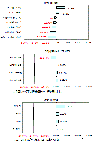 米国の10年国債利回りは、週前半は消費者物価指数が前月比で0.1%下落し、物価の伸び悩みが鮮明となったとの見方から、一時昨年11月以来となる2.10%の水準まで低下しました、その後は下げ渋り、金利は週間では0.049%低下しました。英国、ドイツ10年国債利回りは、小幅上昇しました。日本10年国債利回りは横ばいとなりました。