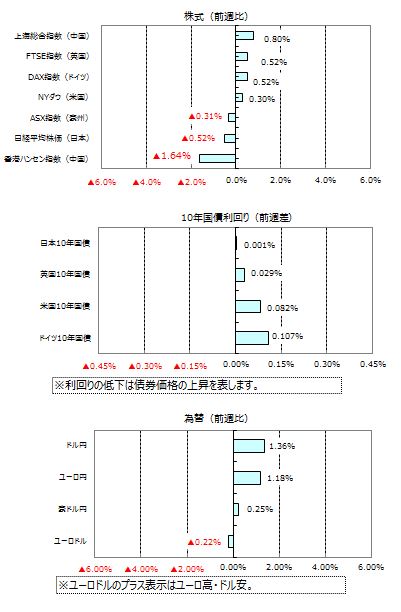 米国の良好な経済指標発表などを受けて米欧長期金利が上昇する中、日本銀行が債券への指値オペを行い金利上昇をけん制したことなどから、円相場は対ドルでは週間で1.36%の円安・ドル高となりました。対ユーロでは1.18%の円安・ユーロ高となりました。