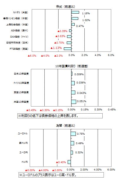 主要国の長期金利は上昇しました。米国の10年国債利回りは、消費者信頼感指数など良好な経済指標を受けて上昇しましたが、米連邦公開市場委員会(FOMC)がハト派的な内容であったことから上昇幅が縮小し、週間で0.051%上昇しました。ドイツと英国の10年国債利回りは、経済指標が予想を上回ったことなどを受けて上昇しました。日本10年国債利回りは小幅上昇しました。