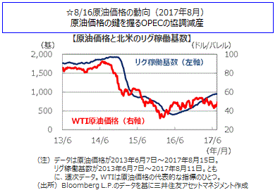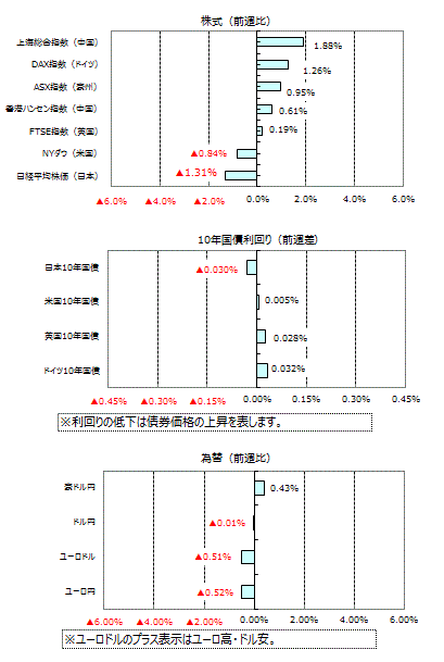 主要国の株式市場は、週間ではまちまちの動きとなりました。米国株式市場では、NYダウは、週前半は北朝鮮情勢の落ち着きを好感して堅調に推移しましたが、後半はトランプ大統領の政権運営への懸念が高まり、週間で0.84%下落しました。欧州株式市場では、DAX指数は上昇しました。週前半は北朝鮮情勢の落ち着きを好感して上昇しました。後半は米トランプ政権の先行きへの不透明感やスペインでのテロの影響などから伸び悩みました。英国のFTSE指数は小幅上昇しました。日経平均株価は、週前半は下落後、一旦持ち直しましたが、週末にかけて円高が進んだことや米トランプ政権の先行きへの不透明感を嫌気して、週間では1.31%下落しました。中国株式市場では、上海総合指数、香港ハンセン指数ともに上昇しました。
