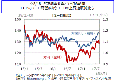 円相場は対ドルでは北朝鮮情勢の落ち着きを好感して週前半は110円台の円安となりました。週後半はトランプ大統領の政権運営への懸念が高まり、一旦108円台の円高となりましたが、バノン首席戦略官の辞任発表を受けて反落し、週間ではほぼ横ばいとなりました。対ユーロでは0.52%の円高・ユーロ安となりました。