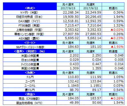先週のマーケットの振り返り(2017/9/18-9/22)【ウィークリー】