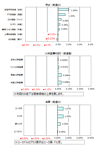 主要国の10年国債利回りは上昇しました。米国の10年国債利回りは、リスク回避姿勢が後退したことや、FOMCを受けて年内の利上げの思惑が高まったことなどから、週間では0.048%上昇しました。ドイツと英国の10年国債利回りも上昇しました。日本10年国債利回りはほぼ横這いとなりました。