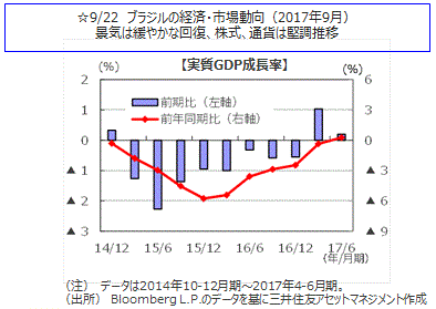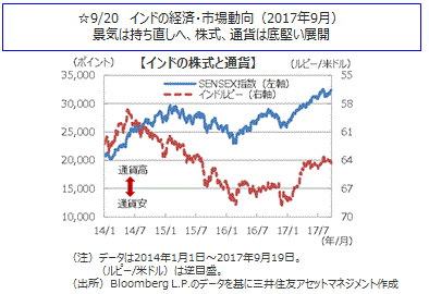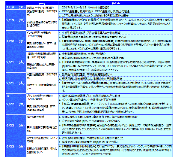 主要国の株式市場は、概ね上昇しました。米国株式市場では、週前半は前週に続き北朝鮮への警戒感がやや後退し、上昇して始まりました。その後、注目された米連邦公開市場委員会(FOMC)は想定の範囲内の結果となり影響は軽微となりました。またトランプ大統領の国連演説に反発して、北朝鮮が挑発的な言動で応じましたが、影響は限定的となり、週間ではNYダウは0.36%上昇しました。欧州株式市場では、英国のFTSE指数は、原油高などを好感して1.32%上昇、独DAX指数は0.59%上昇しました。日経平均株価は19日に、円安や米国株高などを好感して20,000円を上回り、約2年1カ月ぶりの高値となりました。その後も米長期金利の上昇に伴い円安が進行し、堅調な展開となりました。週間では1.94%上昇しました。中国株式市場では、上海総合指数はほぼ横這い、香港ハンセン指数は小幅上昇しました。