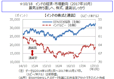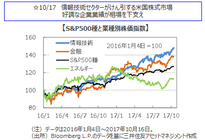 主要国の株式市場はまちまちとなりました。米国株式市場では、発表された経済指標や企業決算が総じて良好であったことや2018年度の予算決議案の上院通過などを好感して堅調に推移しました。週間ではNYダウは2.00%上昇し、最高値を更新しました。欧州株式市場では、世界的な株式市場の上昇傾向は好感されましたが、スペインのカタルーニャ自治州の独立問題の混迷を嫌気して伸び悩みました。英国のFTSE指数、独DAX指数はほぼ横這いとなりました。日経平均株価は、米国株の上昇や衆議院選挙で与党優位の観測が伝わったことなどを好感し上昇しました。過去最高の連騰記録と並ぶ14日連続の上昇となり、週間では1.43%上昇しました。中国株式市場では、香港ハンセン指数はほぼ横這い、上海総合指数は下落しました。