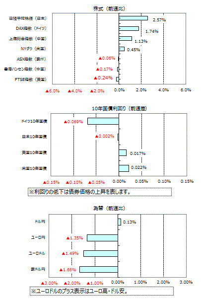 円相場はドルを除いて主要通貨に対して円高となりました。対ドルでは、衆議院議員選挙での与党勝利や日米株高などを受けてリスク選好が強まったことなどから、週間では0.13%の円安・ドル高となりました。対ユーロでは、ECB理事会の決定がハト派的とみられ、週間では1.35%の円高・ユーロ安となりました。