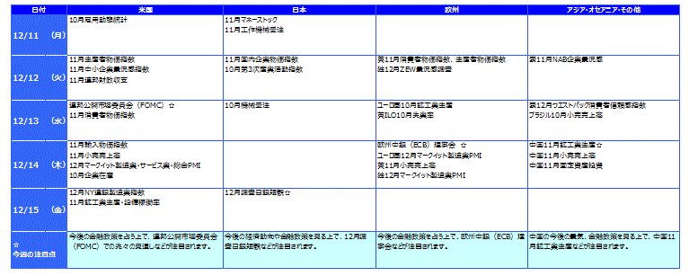 主要国の10年国債利回りは上昇しました。米国の10年国債利回りは、米上院・下院での税制改革法案早期一本化への期待やつなぎ予算が承認されたことなどからリスク選好が強まり、週間では0.015%上昇しました。ドイツの10年国債利回りはほぼ横ばい、英国の10年国債利回りは上昇しました。日本の10年国債利回りは上昇しました。