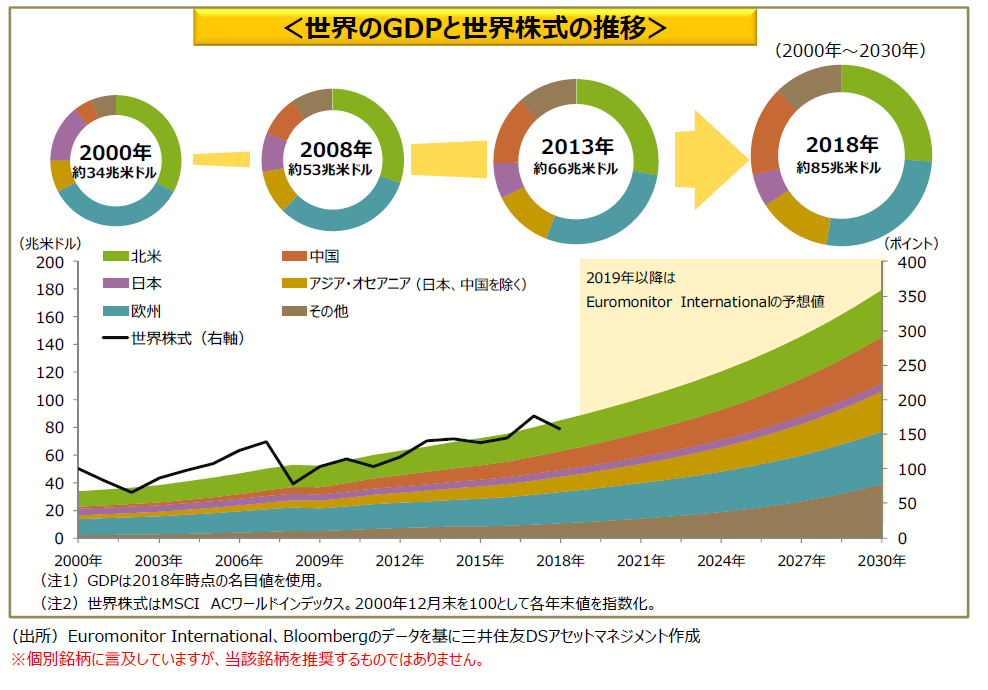 GDPの拡⼤にともなって世界株式は上昇しています。