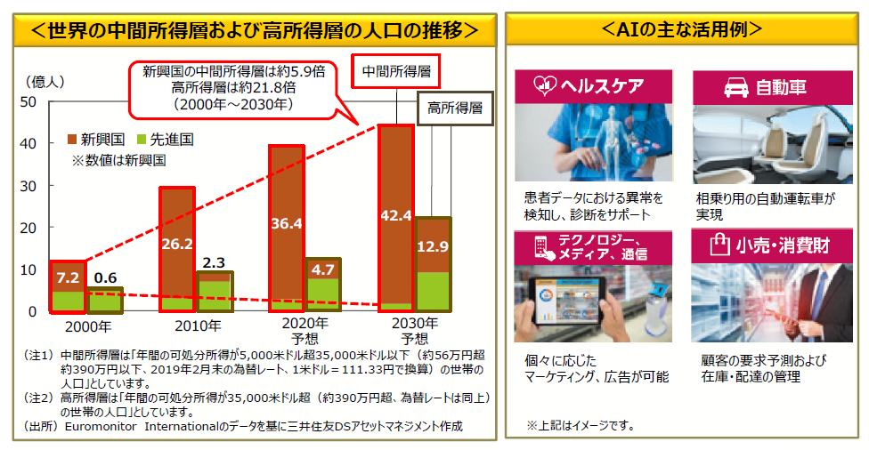 今後、新興国を中心に中間所得層は⼀層増加すると見られており、2030年の新興国における中間所得層は42億人にのぼると予想されています。またIT(情報技術)やAI(人工知能)の進化によって、これまで以上に生活に密着した新しいサービスの普及が期待されていることから、今後も世界的な個人消費の拡大が続くことが見込まれています。そのため、GDPと企業の価値(株価)もさらに上昇すると考えられており、長期的に株式等への投資を続けることによって、それらの恩恵を享受できる可能性が高まります。