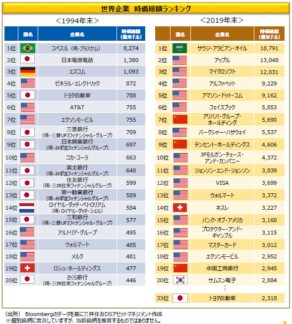 世界経済の拡⼤を受け、世界企業の時価総額は25年前に⽐べて⼤きく拡⼤しています。⼀⽅、⽇本の製造業を代表するトヨタ⾃動⾞は1994年末に5位だったものの、2019年末には33位となっており、⽇本企業の⽐率は1994年末対⽐で⼤きく減少しています。