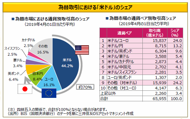 ⽶ドルが世界の取引⾼の約40%を占めています。また、通貨の組合せでも対⽶ドルの取引が全体の約90%となっています。