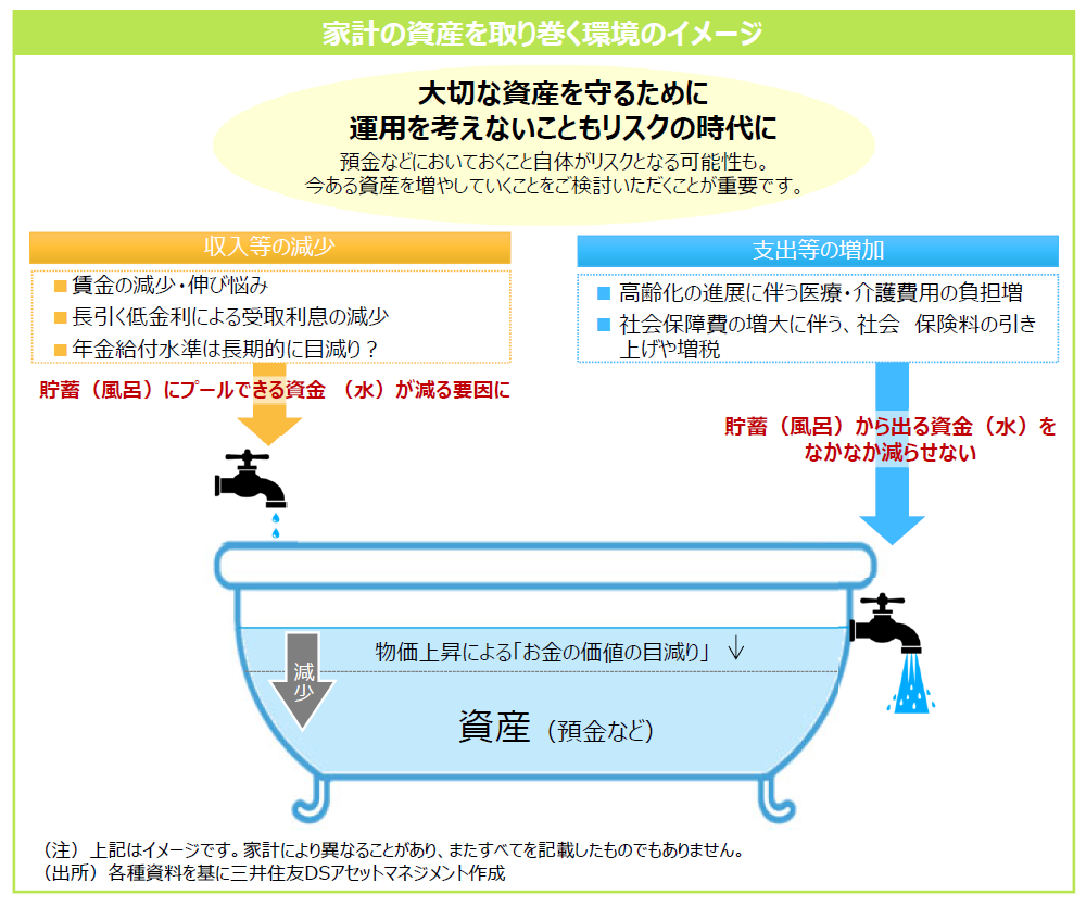 ⻑引く低⾦利によって、預⾦などでは資産を増やすことが難しいなか、物価の上昇や社会保険制度の⾒直しなどで⽀出が増加してしまう可能性があるからです。