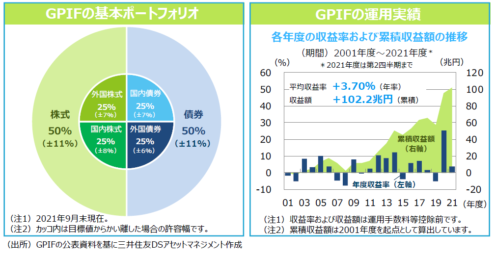 ⽇本の公的年⾦(厚⽣年⾦保険と国⺠年⾦)の運⽤を担っているのがGPIF(年⾦積⽴⾦管理運⽤独⽴⾏政法⼈)です。その運⽤資産総額は約194兆円(2021年9⽉末現在)にのぼり、「世界最⼤級の年⾦基⾦」となっています。GPIFは、インフレやデフレをはじめとする様々な運⽤環境の下で、⻑期にわたり安全かつ効率的に年⾦積⽴⾦を運⽤するため、「分散投資」を⾏っています。「分散投資」は、複数の資産を組み合わせて運⽤を⾏うことで、投資におけるリスクを低減させるための⽅法として、広く知られています。