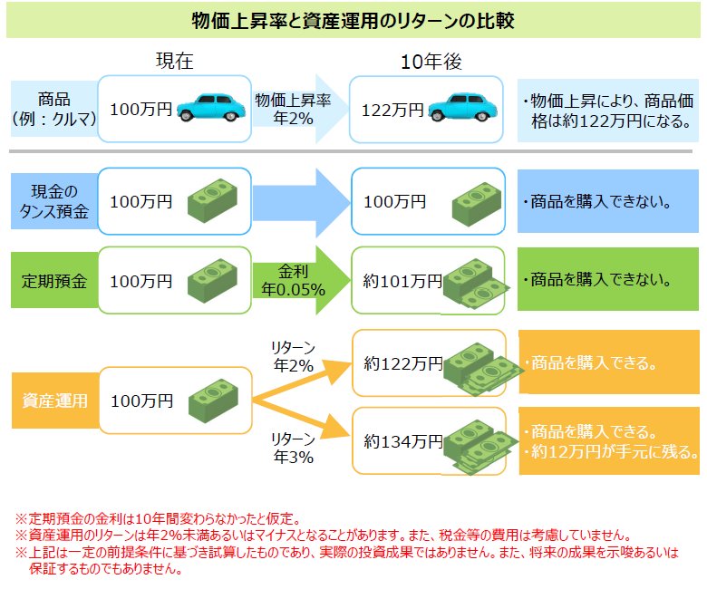 100万円を運⽤し、同期間のリターンが年2%だった場合、10年後の資産価値は約122万円となり、当該商品を購⼊することができます。資産運⽤は、物価上昇への備えとして有効な⼿段の⼀つと考えられます。