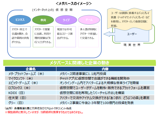 メタバースでは、利⽤者が分⾝である「アバター」を動かして経済活動や交流を⾏うことができます。旧フェイスブックが社名を「メタ・プラットフォームズ」に変更したことなどから急速に注⽬が⾼まっています。⽇本でもKDDIが「バーチャル渋⾕」として仮想空間に街を再現するなど、メタバース事業に参⼊する企業が増えています。今後もメタバースを⼤きなビジネスチャンスとしてとらえたさまざまな分野の企業が参⼊することが予想されます。
