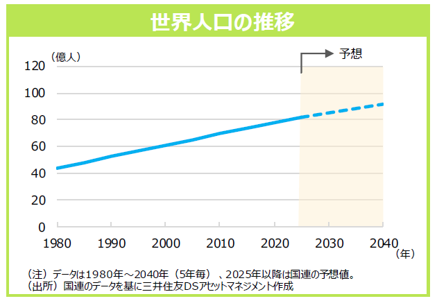 2040年には約92億人にまで増加すると予想されており、今後も世界の経済成長が続くと見込まれます。