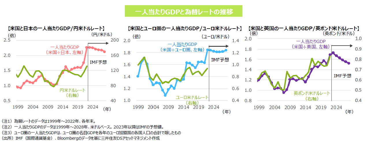 - 各グラフは、為替レートの推移と各通貨ペアの一人当たりGDPの関係を表しています。過去、相対的に一人当たりGDPが大きくなった通貨は、為替レートが上昇する傾向にあるようです。