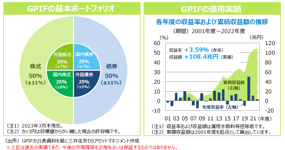 2022年度の運用実績(収益額)は、1年を通じて市場変動(ボラティリティ)の大きい状況が続き、第1~第3四半期に3四半期連続でマイナスとなったものの、通期では+2兆9,536億円となりました。2001年度(市場運用開始)以降の累積収益額は約108.4兆円にのぼっています。