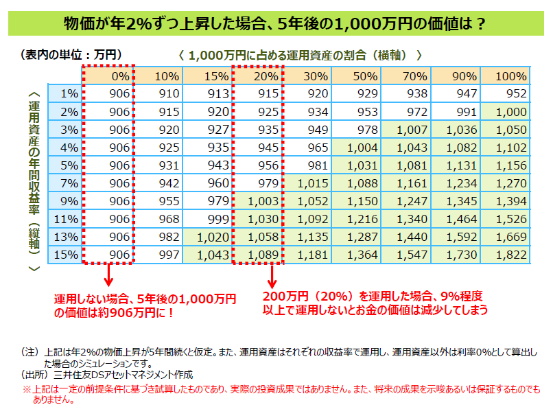 仮に、物価が継続的に年2%上昇する中、何も対処しなかった場合には、実質的なお金の価値は減少してしまいます。こうしたお金の価値の減少への対処方法の一つとして資産運用があります。ただし、金融資産に占める「運用資産の割合」によって、お金の価値を維持するための「年間収益率(必要な利回り)」は変わってきますので、「運用資産の割合」を考えていくことが重要です。