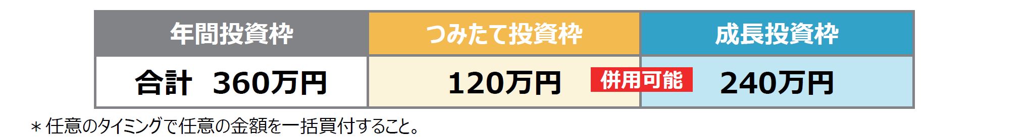 新しいNISAでは、「つみたて投資枠」と「成⻑投資枠」の併⽤が可能であり、「成⻑投資枠」の買付⽅法として積⽴・スポット*どちらも可能であるため、「つみたて投資枠」の年間投資枠(最⼤120万円)をすべて利⽤した後も、「成⻑投資枠」の年間投資枠(最⼤240万円)が残っていれば、積⽴投資を続けることができます。