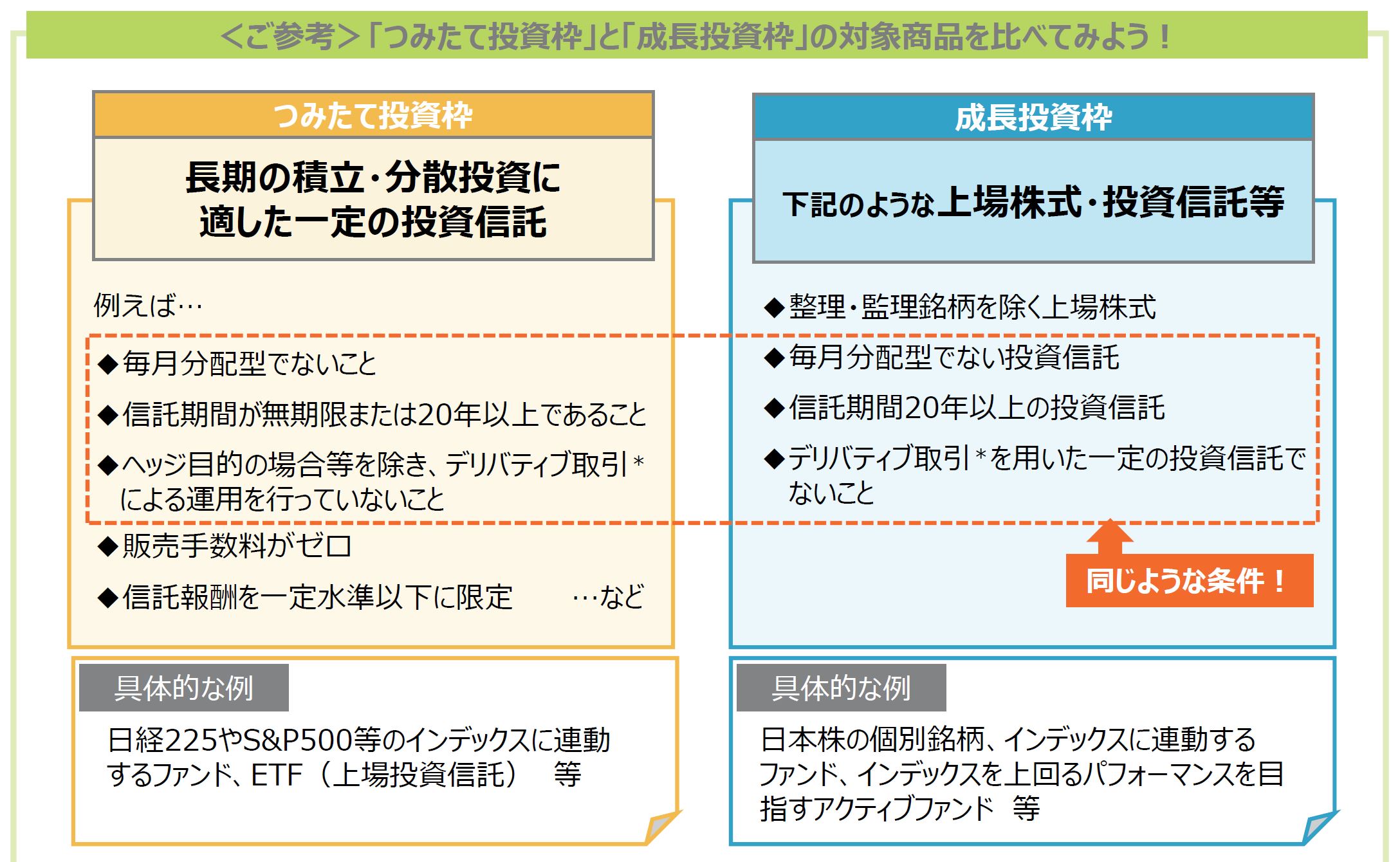ただし、「つみたて投資枠」と「成⻑投資枠」では対象商品が異なるため、同じ商品で積⽴投資を継続できない場合があります。「成⻑投資枠」でしか投資できない商品を積⽴投資するのも良いかもしれません。(詳しくは下部のご参考へ)