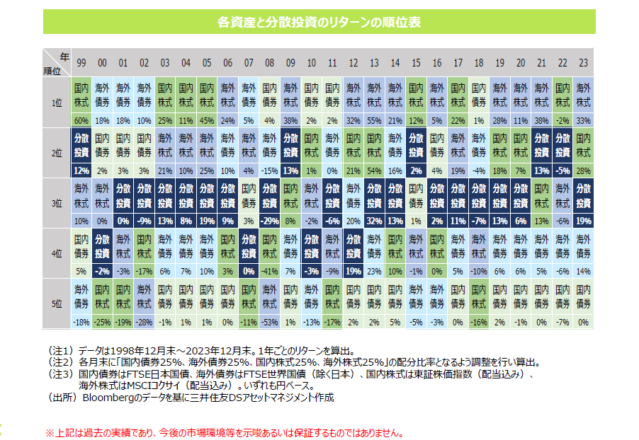 ◆資産運用におけるリスクとは値動きの幅の大きさを指します。単一の資産だけではなく複数の資産に分散投資することは、リスクを低減させるのに役立ちます。下図は国内債券、海外債券、国内株式、海外株式と、それぞれに均等に分散投資を行った場合の1年間のリターンの順位表です。それぞれの資産の順位は年によって大きく変動している一方で、分散投資は異なる性質の資産がお互いを補うような値動きをし、その幅が抑えられることによって概ね中位を維持しています。このことから、分散投資は、リスクを抑え、安定的なリターンを得るのに有効な手段と考えられます。