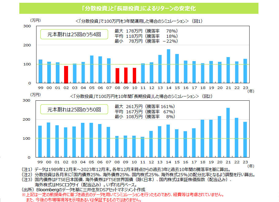 ◆(図1)、(図2)はこの分散投資の手法を用いて、100万円を3年間運用した場合と、10年間運用した場合のシミュレーションの結果です。3年間運用した場合、元本割れをした回数は4回であったものの、10年間運用した場合は0回でした。シミュレーションの期間内にはいわゆる日本のバブル景気やITバブルの崩壊、リーマンショックやコロナショックといった様々な大きく相場が下落した出来事が含まれていますが、リスクを抑えながら、長期間にわたり安定してリターンを得たことで元本割れを防ぐことができています。リスクを低減させ、リターンを安定させるために有効な手段と考えられます。