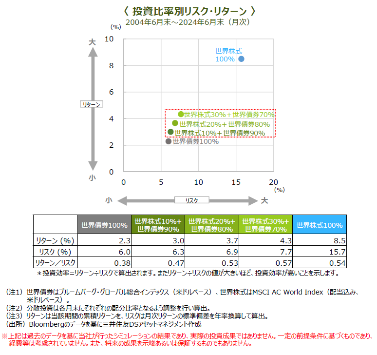 ◆リスクに対するリターンの値が⼤きいほど、投資効率*が⾼いことを⽰します。世界債券に100%投資した場合に⽐べて、世界株式を併せ持つケースでは投資効率が相対的に⾼く、リスク⽔準を抑えつつリターンが向上することが期待されます。