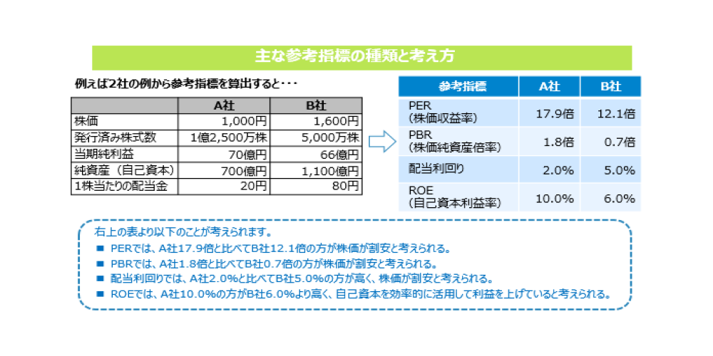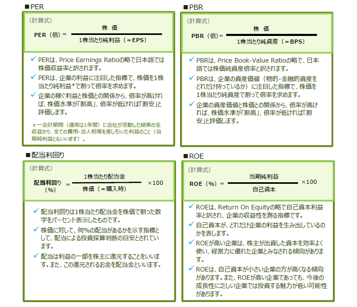 「PER」「PBR」のように株価が割安か割⾼かの判断などに活⽤される参考指標があります。