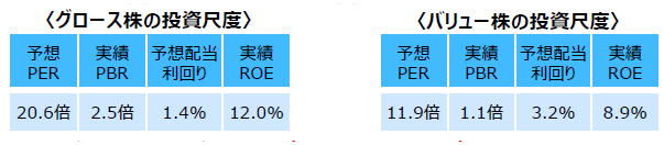 グロース株は、成長性や将来性に対する評価が高い株式とされます。こうした株式は一般的にPERやPBRが比較的高く、配当利回りは低く、ROEは高いといった特徴があります。このような株式へ投資するスタイルはグロース株投資といわれます。一方で、バリュー株は、企業が⽣み出す利益や保有資産などから算出される企業価値と⽐較して、株価が低い状態(割安)にある株式とされます。一般的にPBRとPERに注目し、競合他社や⾃社の過去平均等との⽐較で⾼いと割⾼、低いと割安とされます。配当利回りは比較的高く、ROEは低いといった特徴があります。このような株式へ投資するスタイルをバリュー株投資といいます。